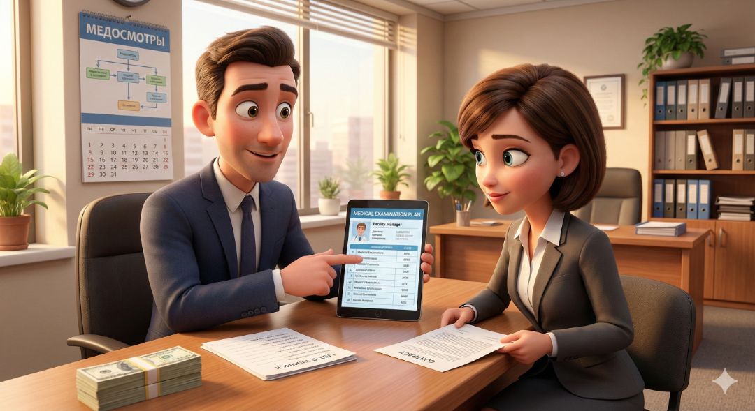 Для этого он определяет количество сотрудников и тип проводимых медосмотров, находит близлежащее медицинское учреждение, которое оказывает такие услуги и организовывает проведение медицинских осмотров в этой организации.