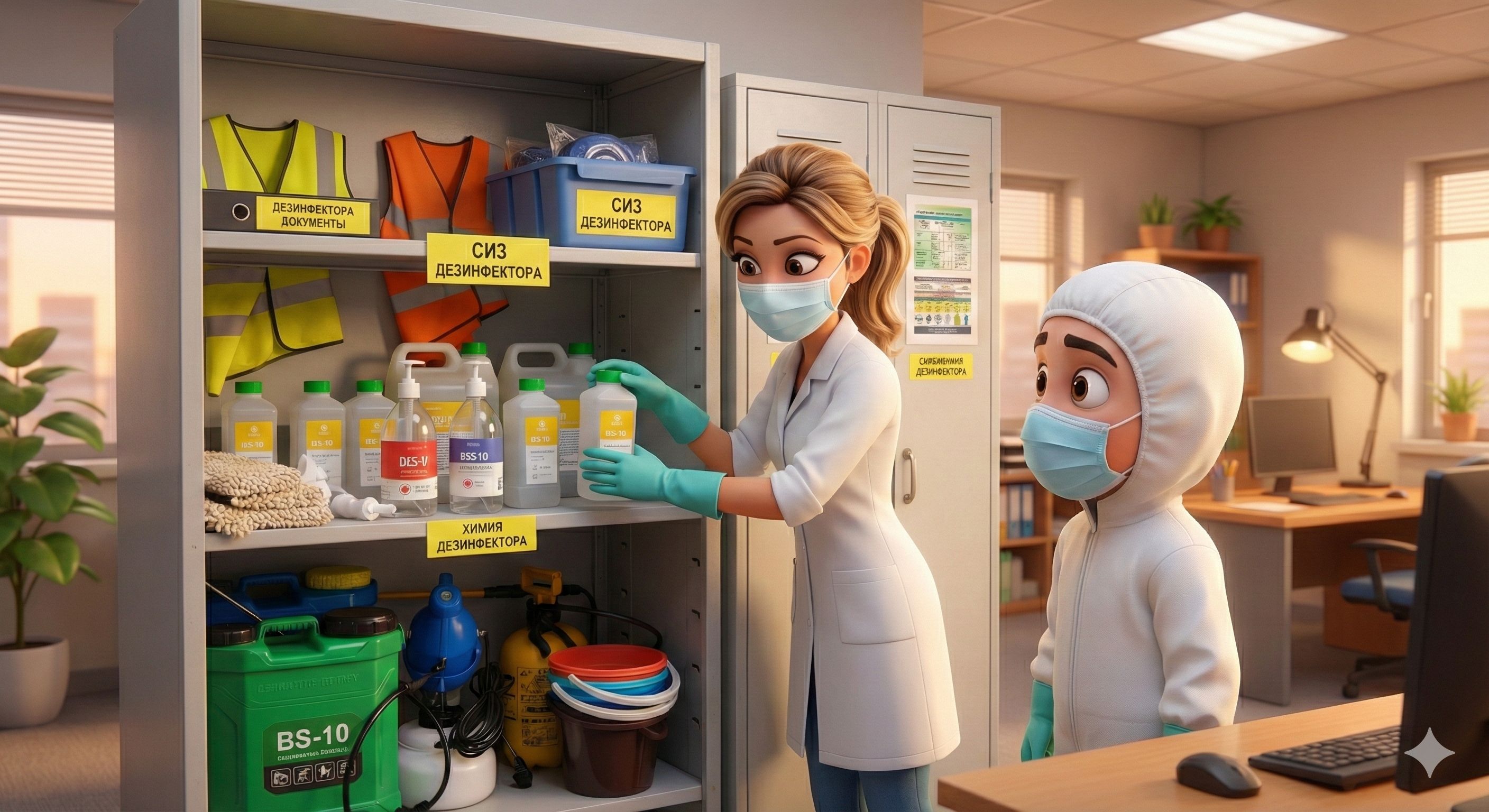 - Выделенное помещение или специально оборудованные шкафы для хранения дезинфицирующих препаратов.