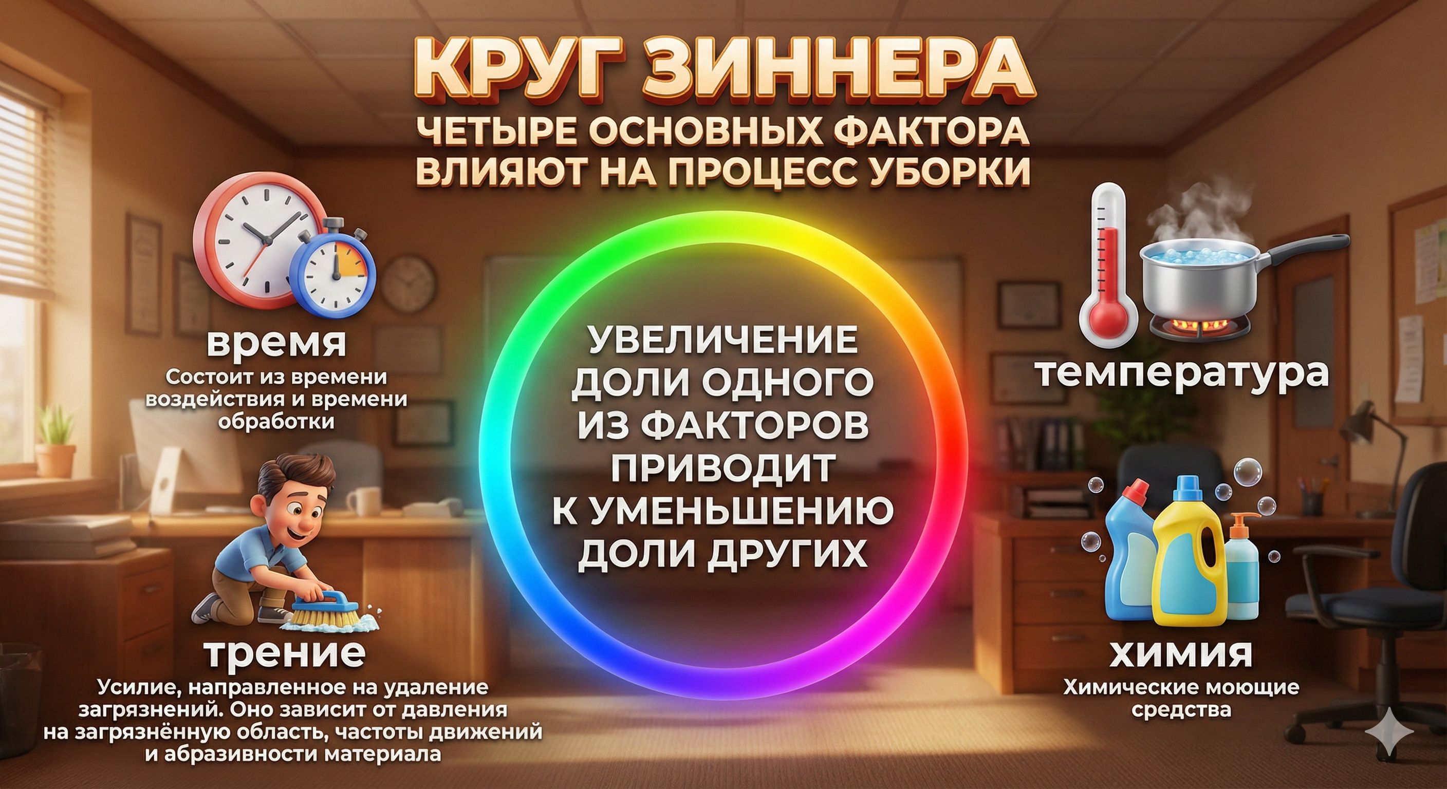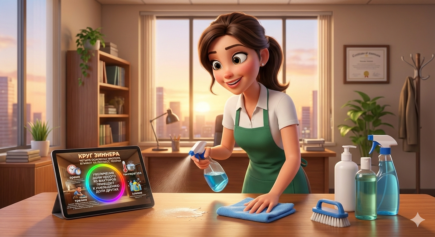 Круг Зиннера в профессиональном клининге помогает наглядно показать, взаимодействие и зависимость четырёх важных факторов при процессе уборки.