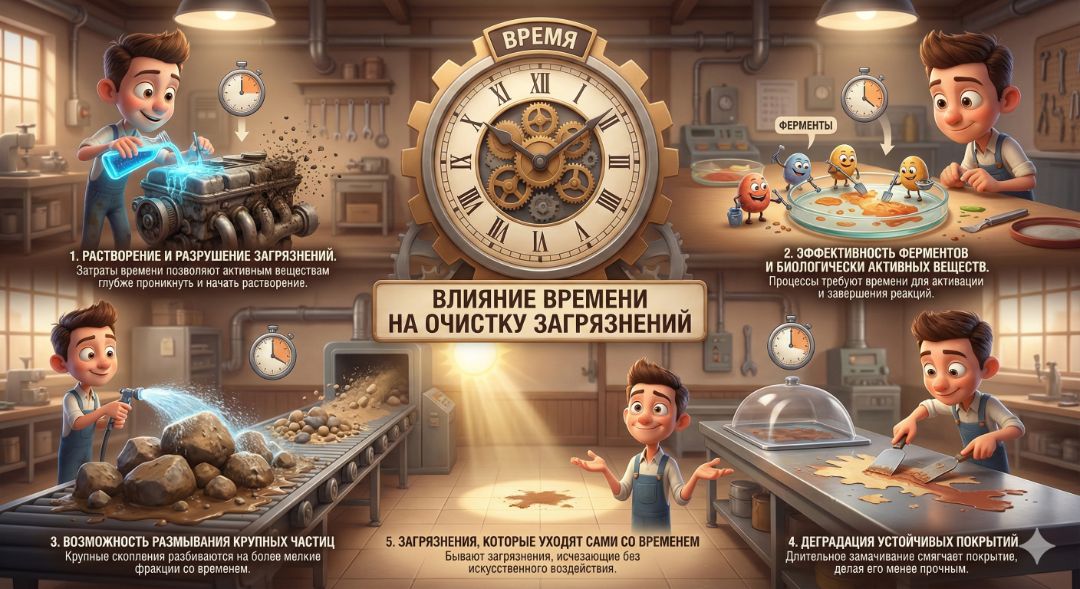 Время играет важную роль в процессе очистки сложных загрязнений, поскольку длительность контакта моющего раствора с загрязнением существенно влияет на результат.