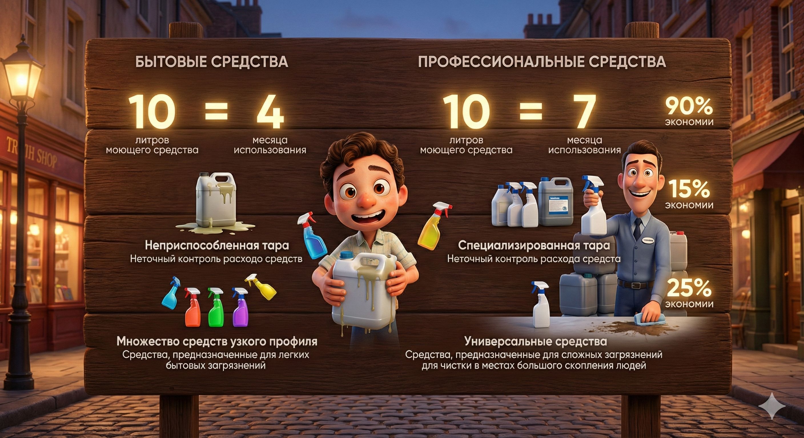 Приготовленные (бытовые),средства дороже в разы, чем разбавленные профессиональные аналоги концентраты.