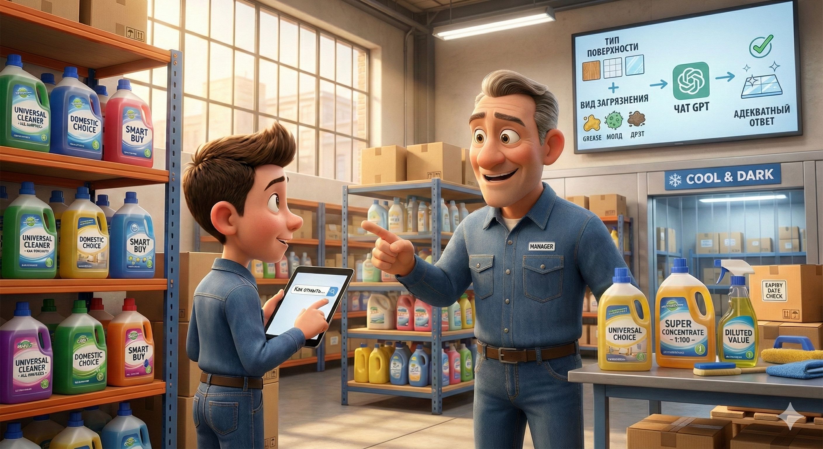 Если знать два ключевых параметра Тип поверхности и Вид загрязнения, мы можем составить корректный вопрос чату GPT и получить адекватный ответ.