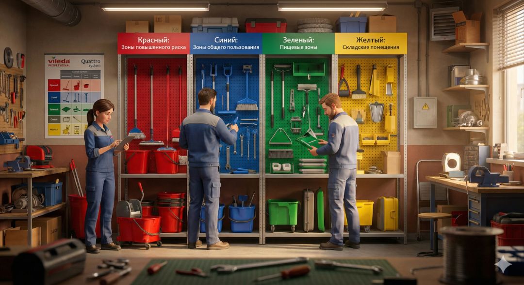 Интеграция системы цветового кодирования (например, стандарта Vileda Professional Quattro) в процедуру учета является критическим требованием для соблюдения санитарно-гигиенических норм и предотвращения перекрестного загрязнения. Учетная система должна воспринимать "Ведро красное" и "Ведро синее" как два разных номенклатурных артикула, не подлежащих взаимозамене.