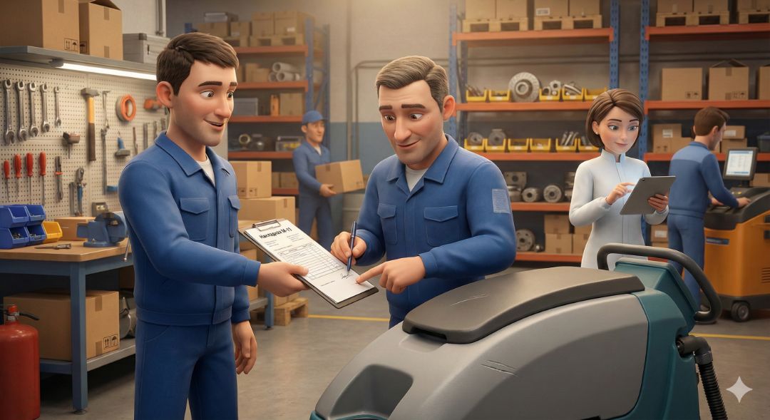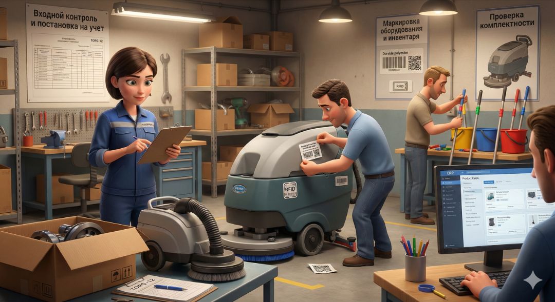 Верификация: Кладовщик сверяет поставку с накладной ТОРГ-12 и спецификацией заказа. Особое внимание уделяется проверке комплектности сложного оборудования (наличие всасывающих балок у поломоечных машин, шлангов и насадок у пылесосов).