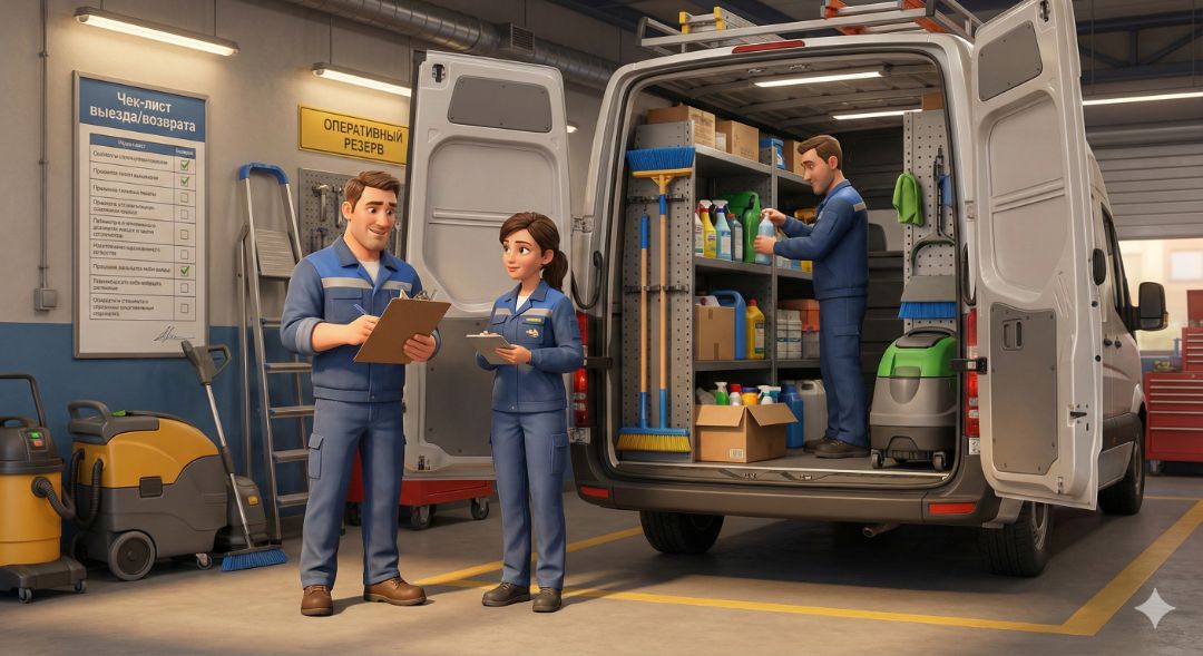Оперативный резерв: В мобильных бригадах должен быть запас расходных материалов (химии, салфеток) на 2-3 смены автономной работы.