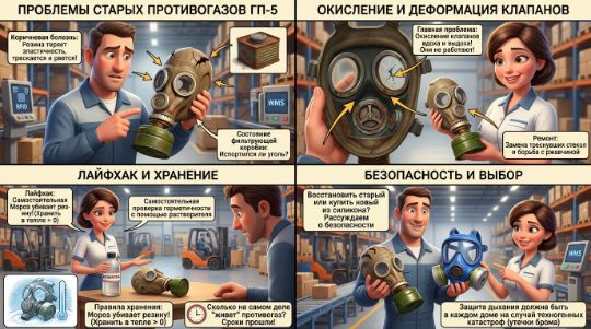 Стоит ли пытаться отчищать и восстанавливать старый ГП-5, или же лучше купить новый противогаз из современных материалов (силикона или латекса, которые не распадаются от времени) — решать вам. Однако иметь дома надежное средство защиты органов дыхания необходимо. Никто не застрахован от техногенных катастроф — например, аварий на железной дороге с разливом токсичных веществ, таких как бром. В подобных ситуациях исправный противогаз может спасти жизнь и здоровье вам и членам вашей семьи.