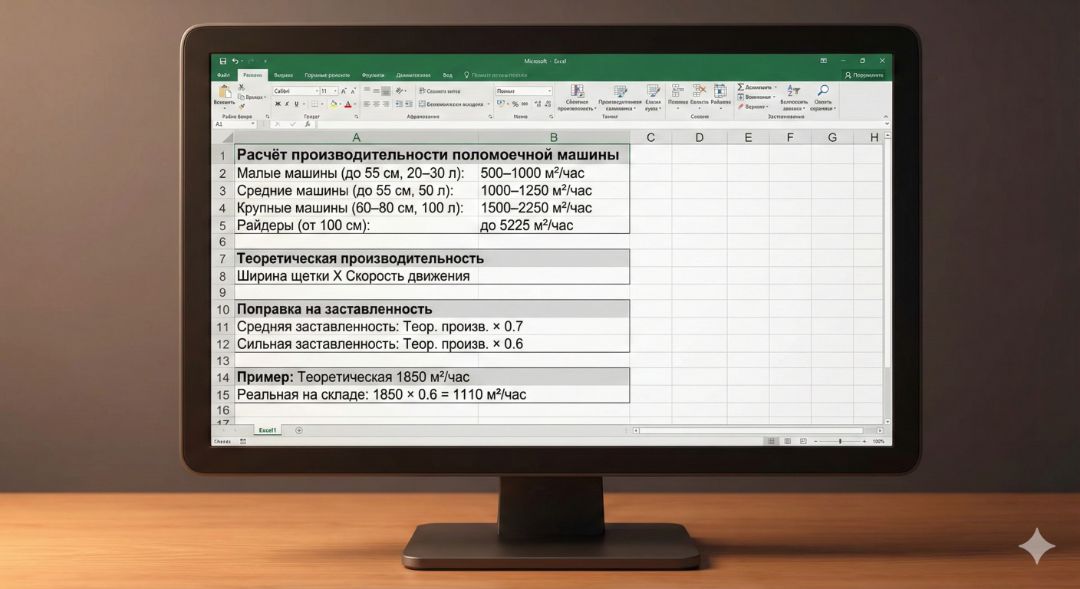 - Справляется ли машина с площадью за отведенное время с учетом коэффициента 0,6–0,7?