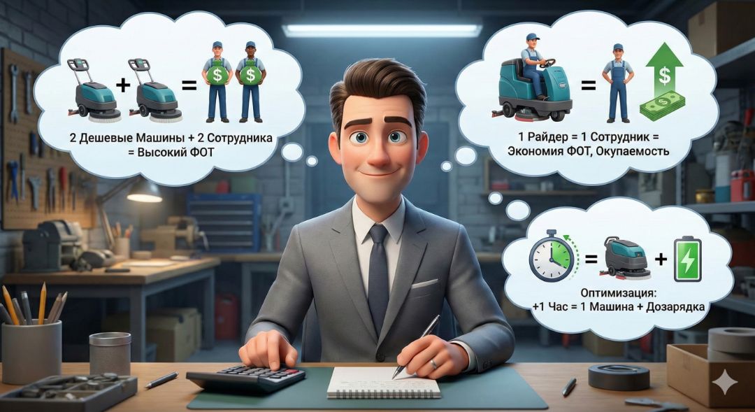- Райдер (машина с сиденьем): Может заменить две толкаемые машины и двух сотрудников. Покупка более дорогого райдера окупается за счет экономии на зарплате второго сотрудника.