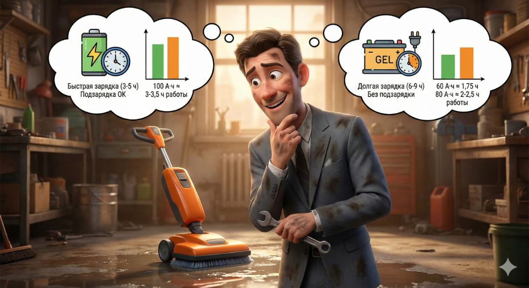 - Литиевый: Быстрая зарядка (3-5 часов), возможность подзарядки во время перерывов (например, пока оператор обедает или сливает воду).